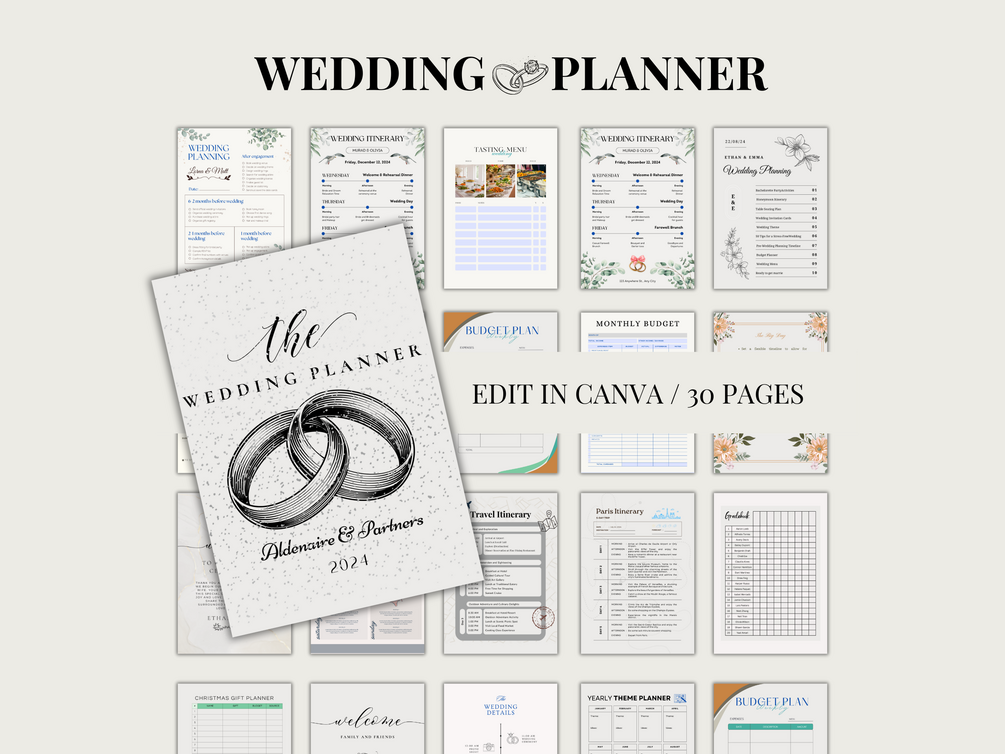 - 30 Editable Pages: Cover every aspect of wedding planning, from budgets to guest lists and timelines.